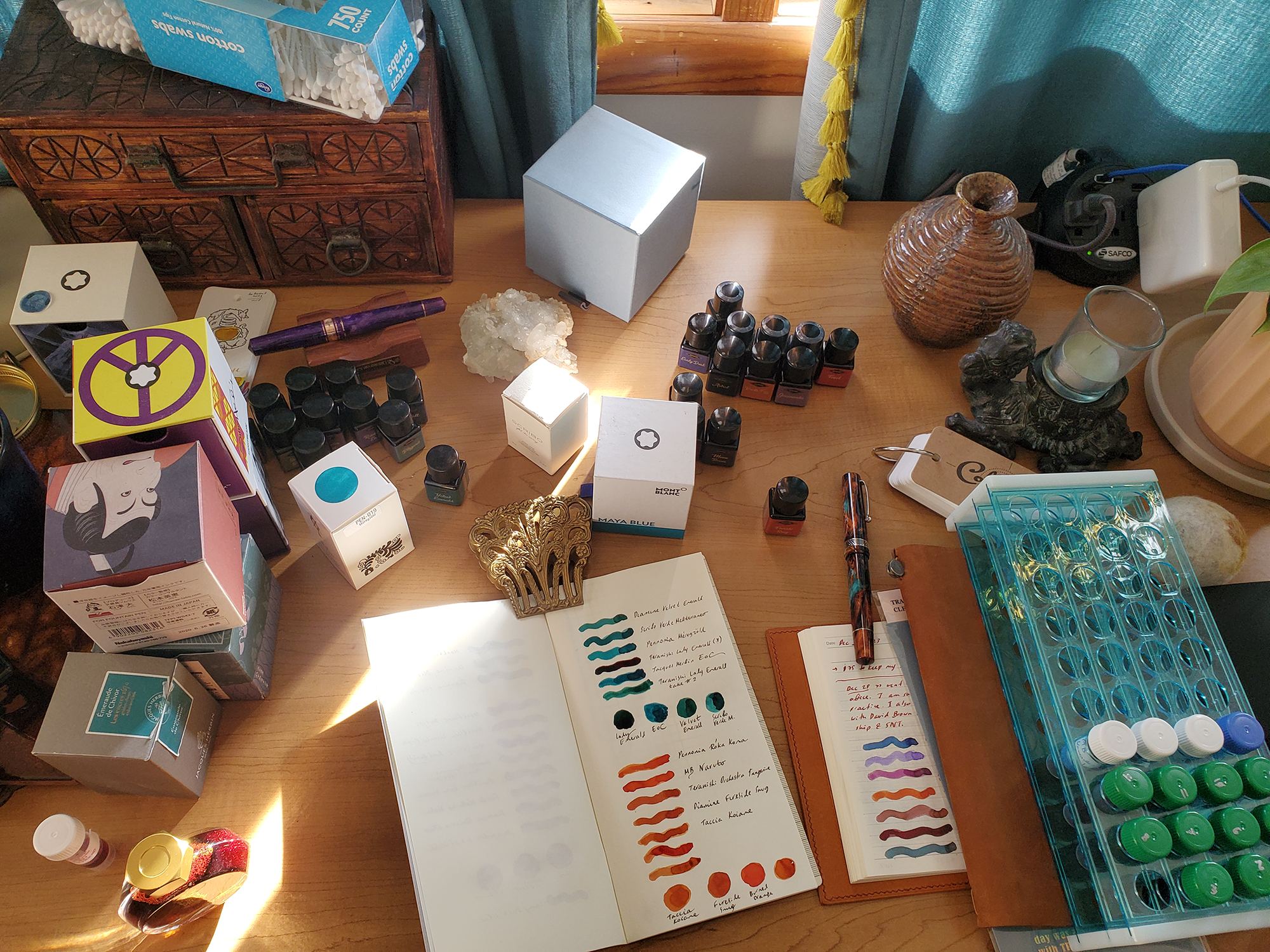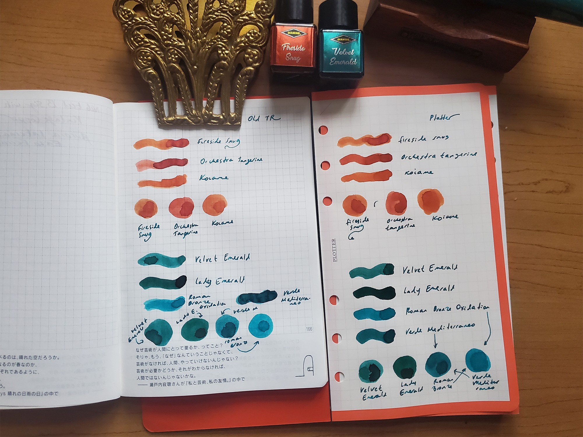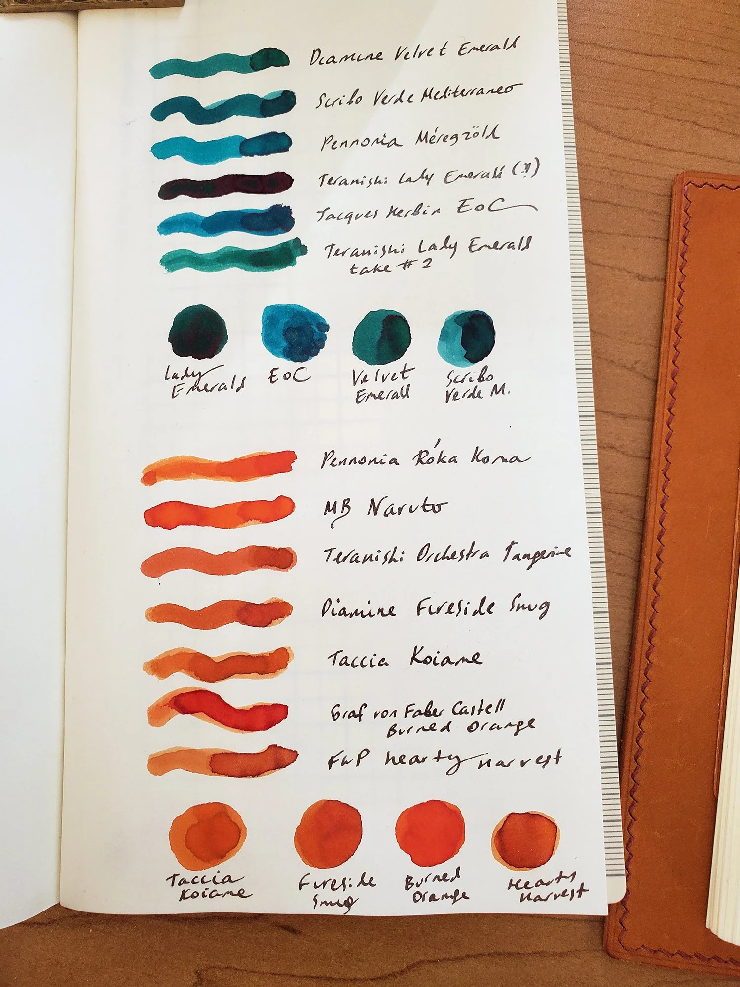 I had some lingering questions about the oranges and the teals, so I did some further comparisons on plotter paper (right) and old Tomoe River (left). Orchestra Tangerine is a bit more red/pink on these papers, but Fireside Snug and Koiame are very close. After staring at these inks on different papers for a while, I feel that I prefer Fireside Snug by a narrow margin, which is a neat surprise - I have loved Koiame for years. and now I have to ink Fireside Snug. But maybe not right away.