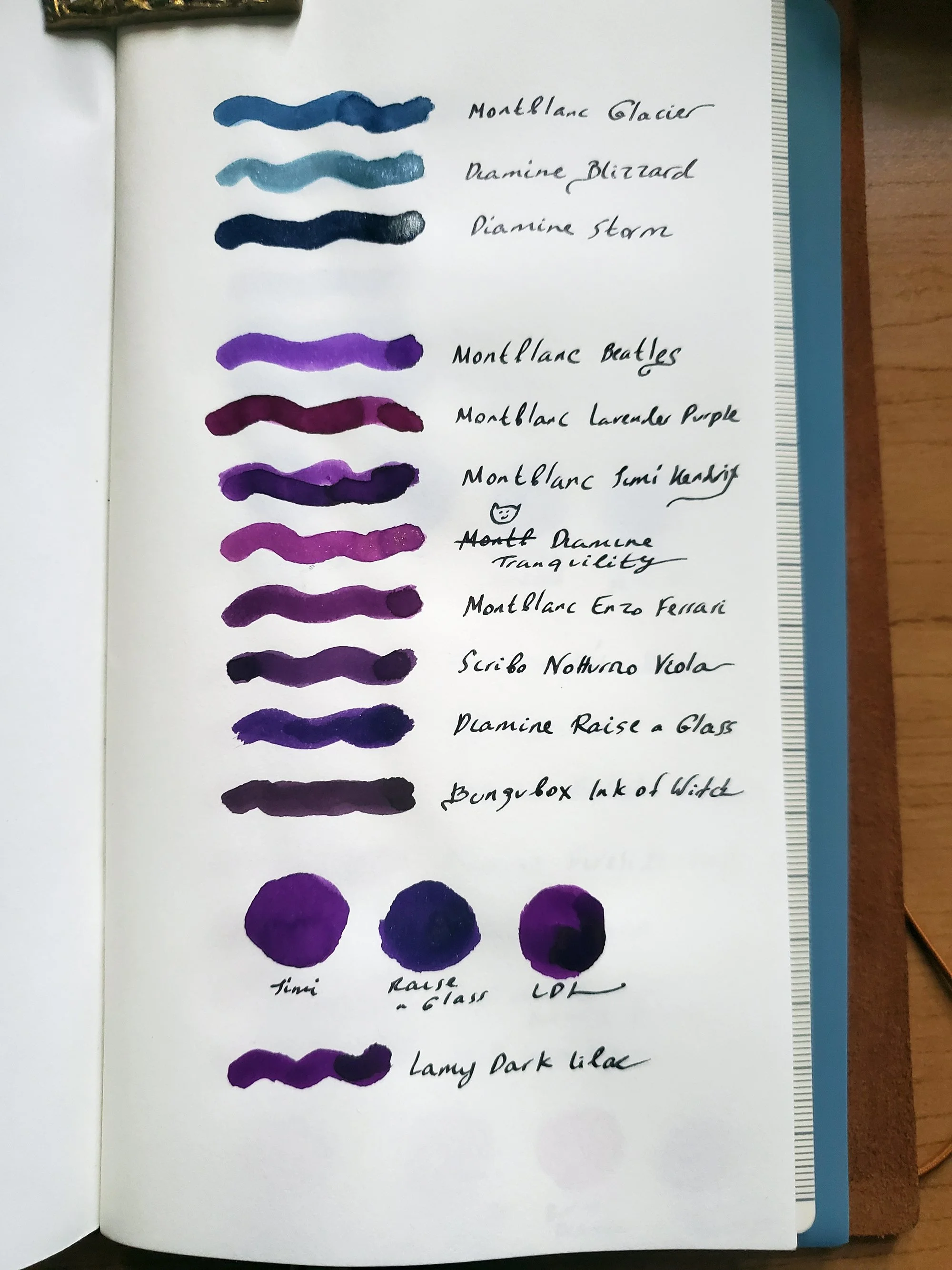 In terms of purples, Raise a Glass is closest to Montblanc Jimi Hendrix, but Raise a Glass is more blue. It is also close to Lamy Dark Lilac, but yet again - more blue.Tranquility is unlike any of the purples I have - it is pinker and brighter.