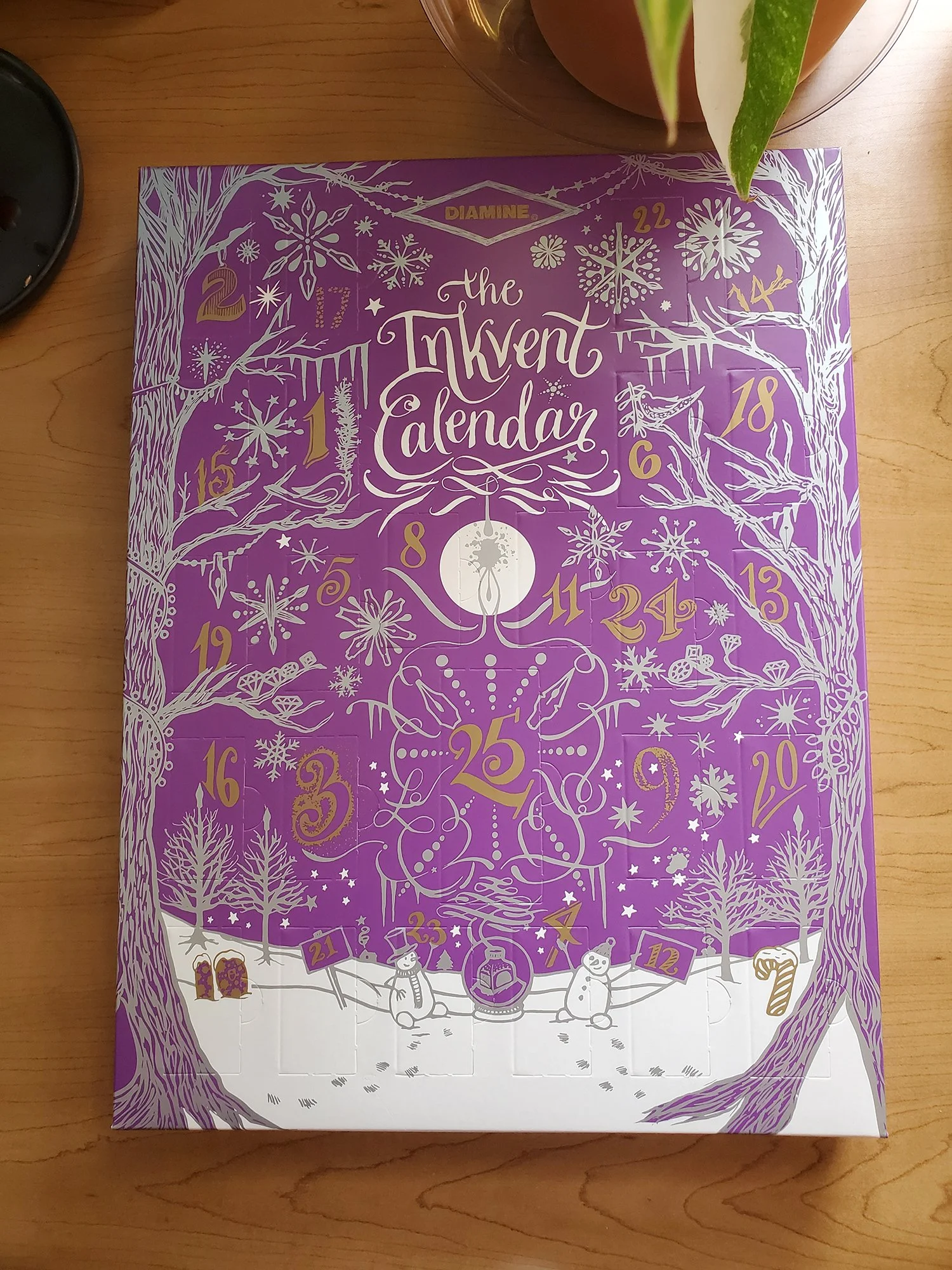 On the 26th of December, Bogi snagged the Purple Inkvent for me, on sale for 50% off. It arrived just before New Year’s, and as a result, I was able to sample the inks. There are many thorough and thoughtful Inkvent reviews out there already, and I’m quite a few days late with this inksploration, but better late than never. I am posting it here as a New Year’s Eve bonus. :)
