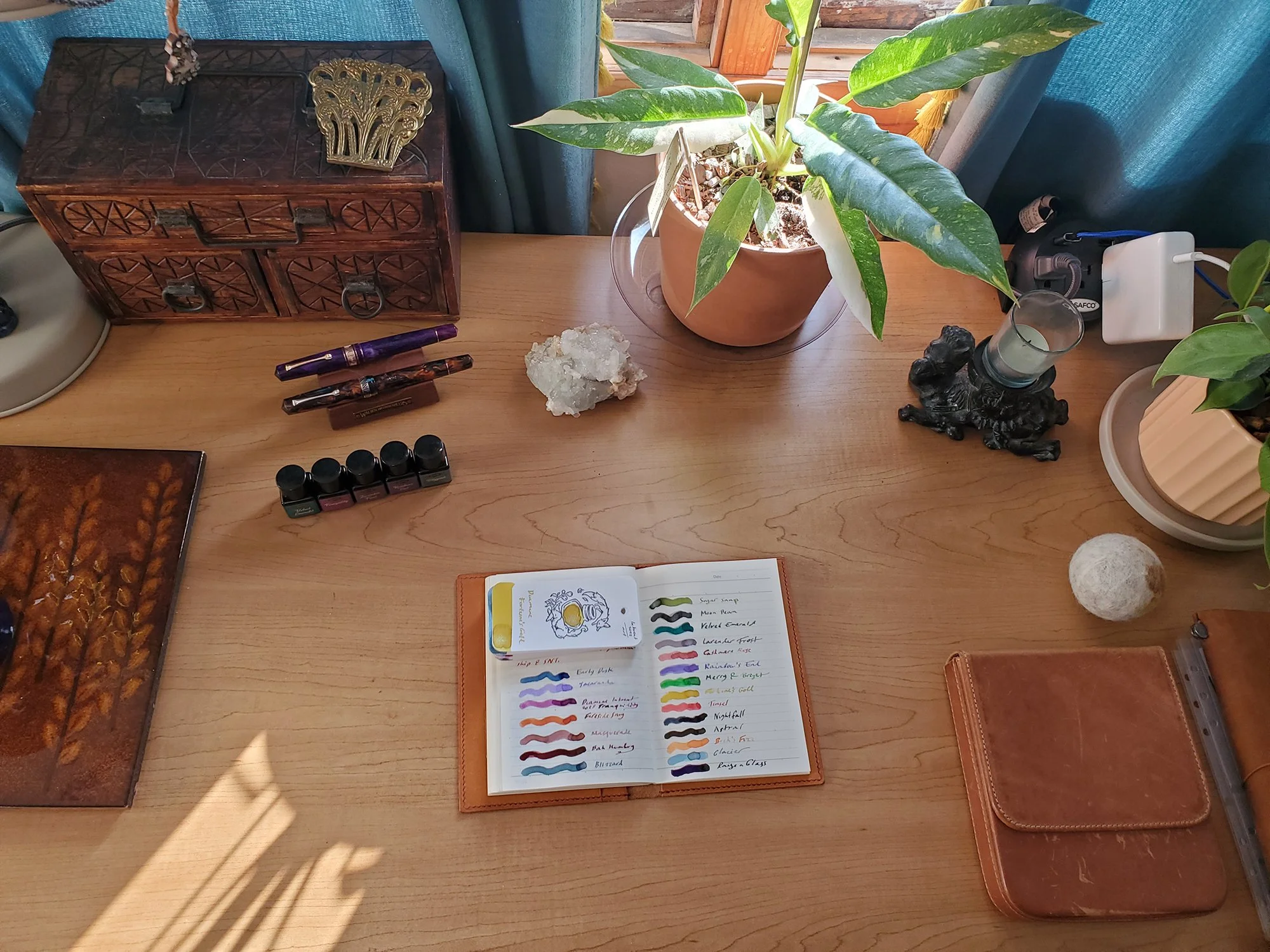 Spending time at my desk makes me happy. Inks rearranged in order of their verdicts: left front YES, left back YES FOR ART, right front MAYBE, right back NO.