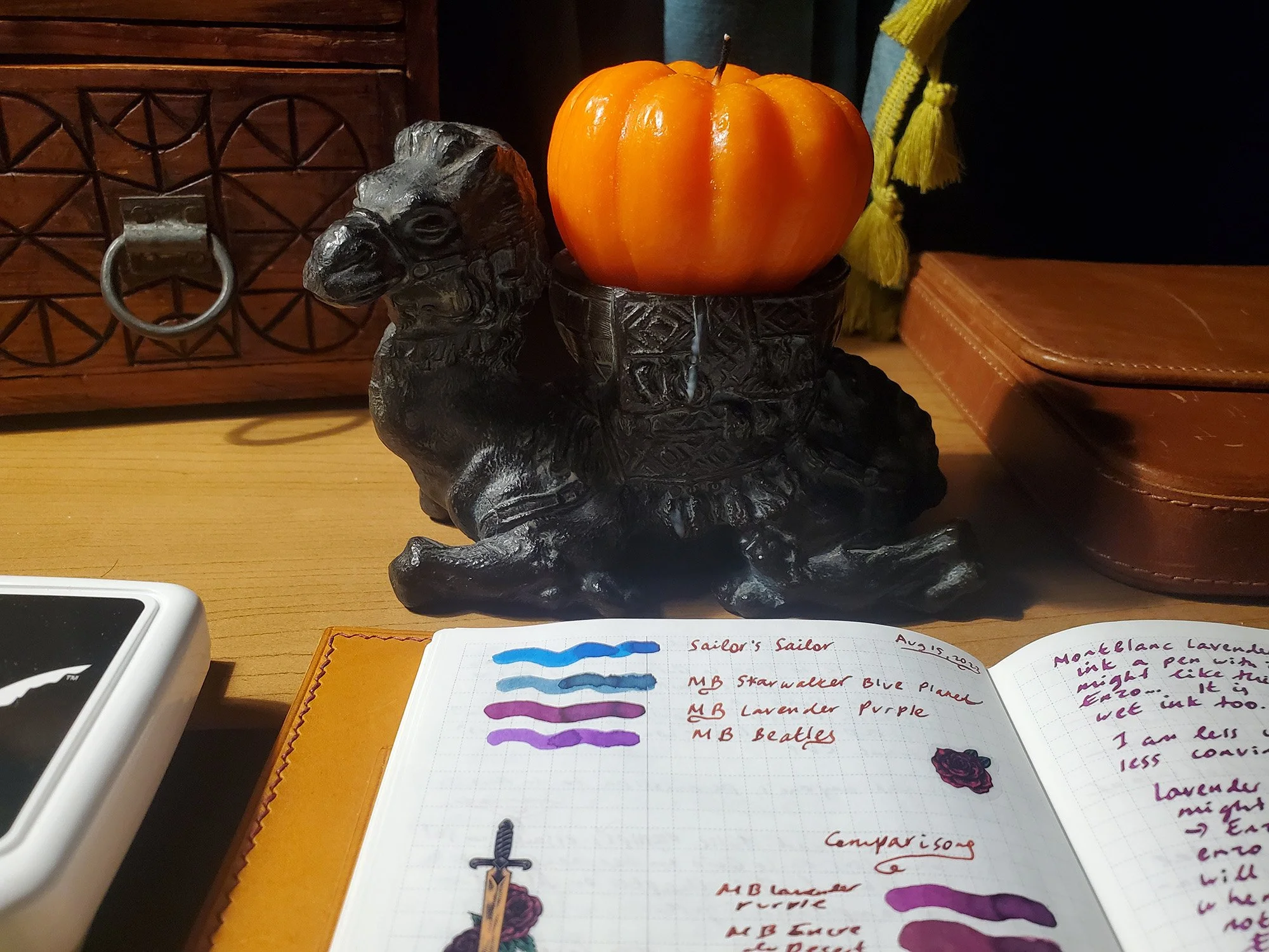 I’m speeding the arrival of fall via a small pumpkin candle sourced from Waxman candles here in town. I found the antique camel at the River Market Antiques in KCMO.