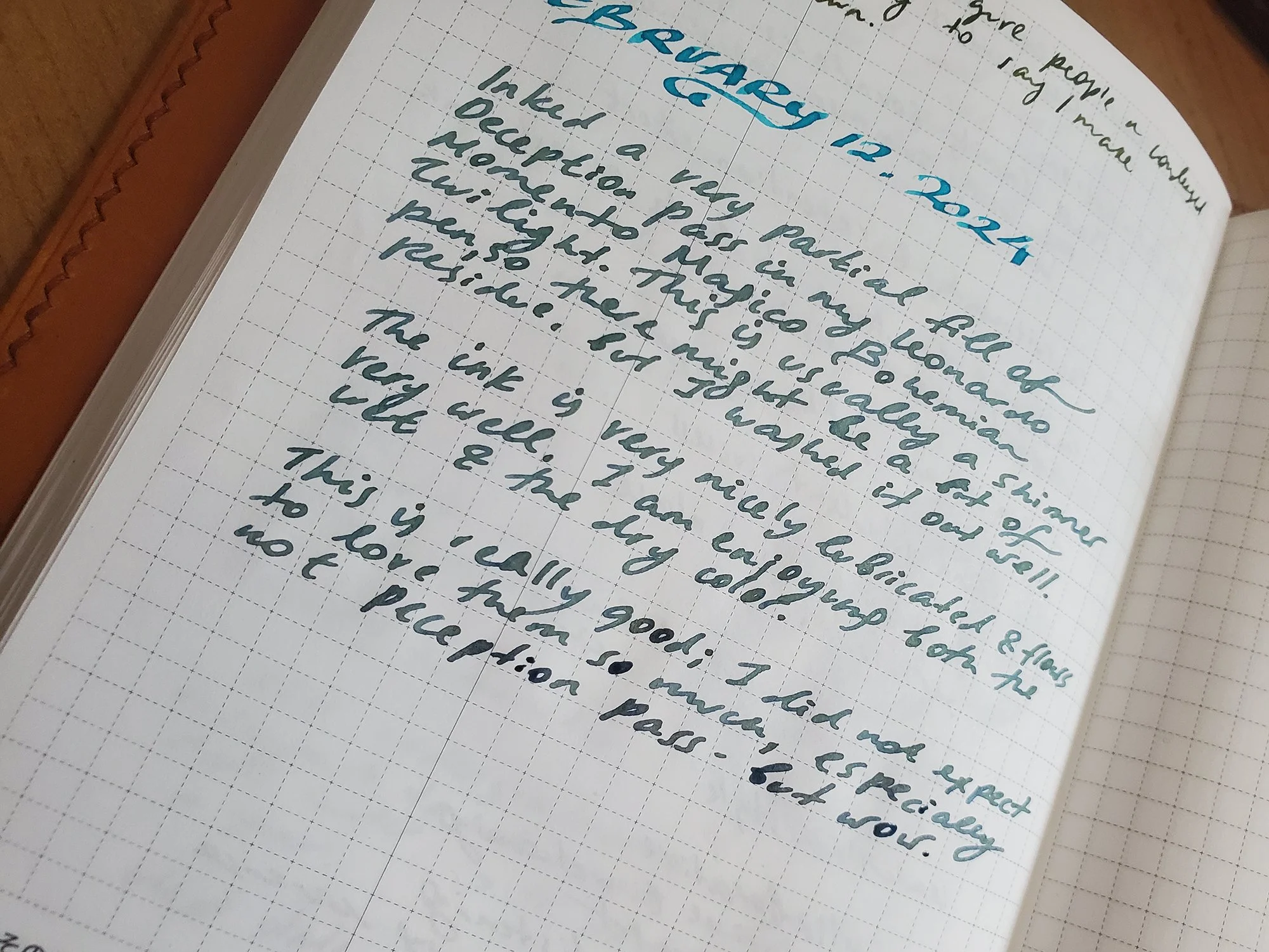 I could not resist putting Deception Pass into a pen right away. It’s just too good. I inked a partial fill in my Leonardo Momento Magico Bohemian Twilight with a Franklin Christoph M SIG nib, and it’s wonderful so far. I’m planning to ink up Elliott Bay next.