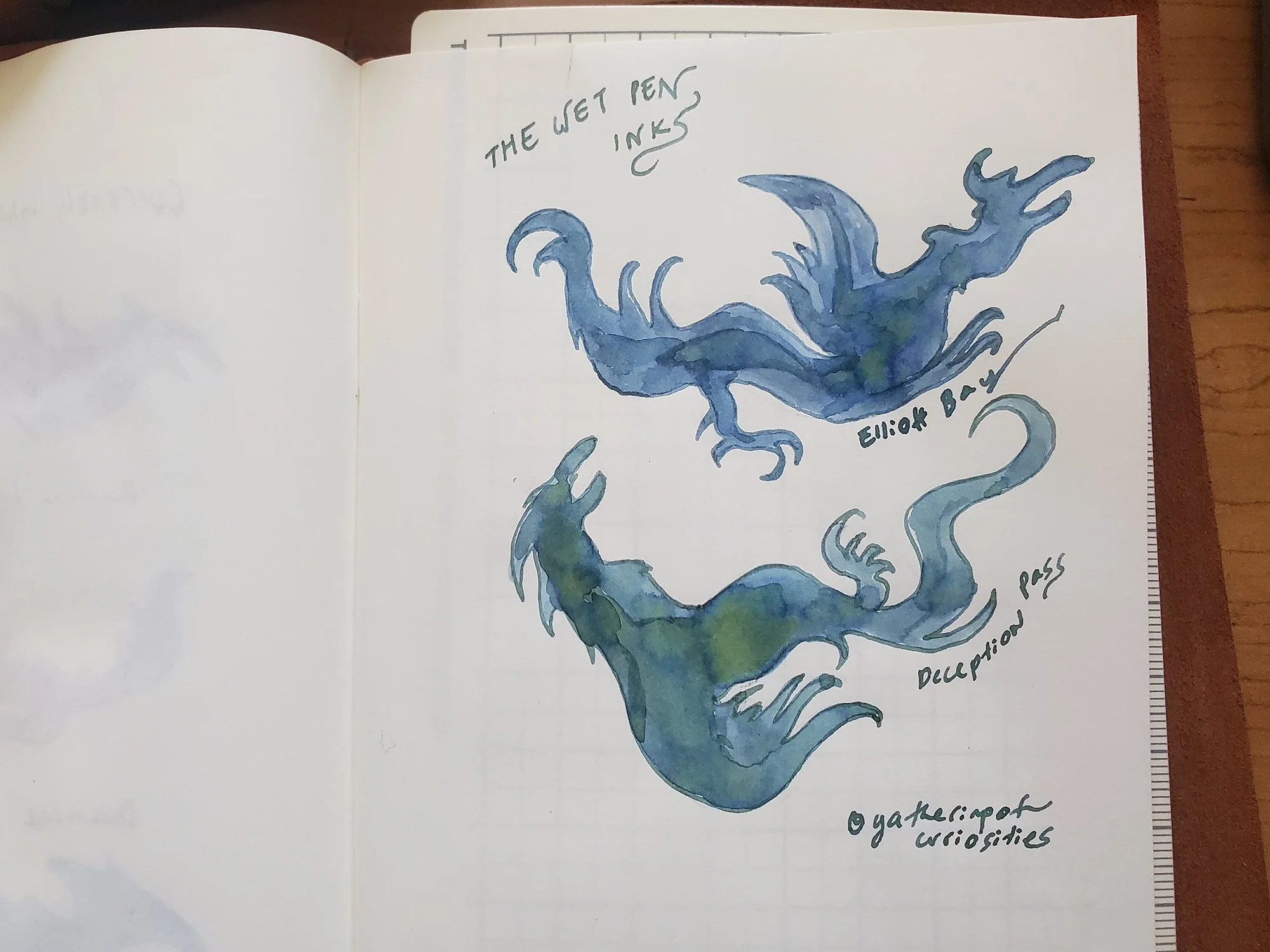 The inks themselves are named after the landscape of the Pacific Northwest, and Matthew’s own home city of Seattle, accidentally one of my favorite cities on earth. Both Elliott Bay and Deception Pass are chromoshaders; both of them have a different color when wet and dry.