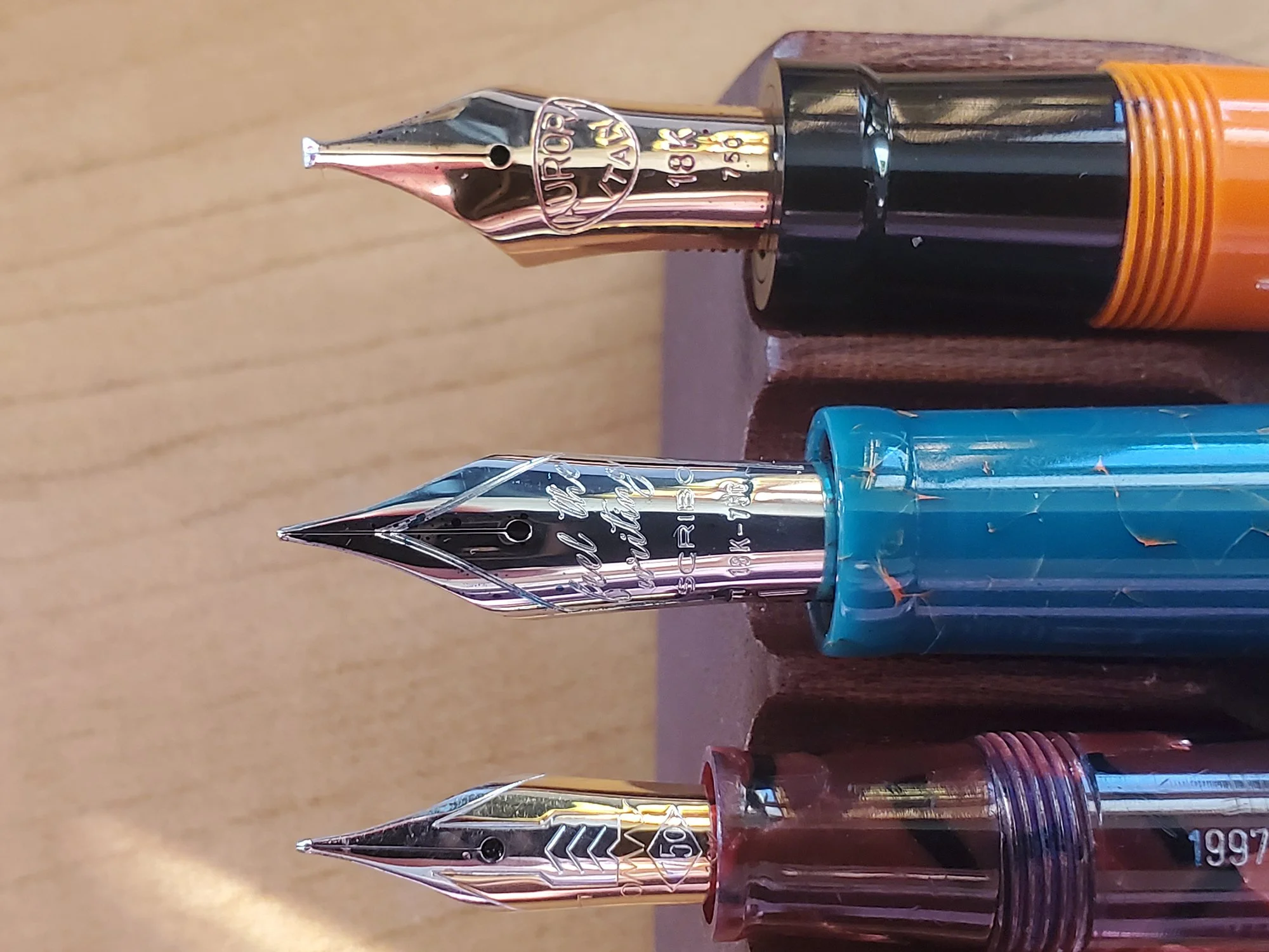Three of my favorite nibs, top to bottom: Aurora Internazionale Italic; Scribo 18k F; Omas 18k F - Dama size. All three are wonderful tools and provide a great sensory experience.