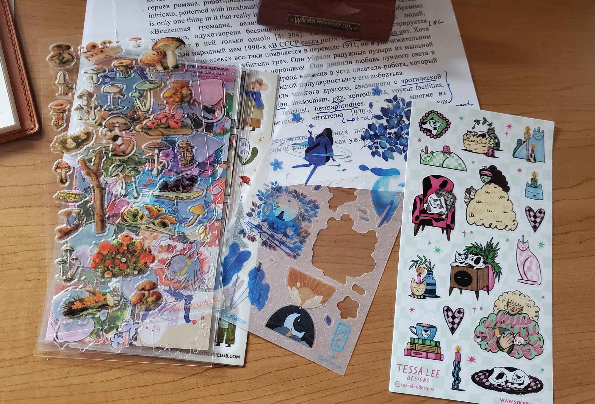 My academic colleagues are sometimes surprised when they see my notebook with stickers or doodles of dragons and birds and what not. It’s ok. Stickers help me spread a little joy. I’m always offering stickers to my students, and occasionally to curious faculty members. I don’t remember anyone saying no. It is a small delight. I love the more painterly stickers, the dreamy ones, and they do not seem as popular as other types of stickers. But stickers are cool.